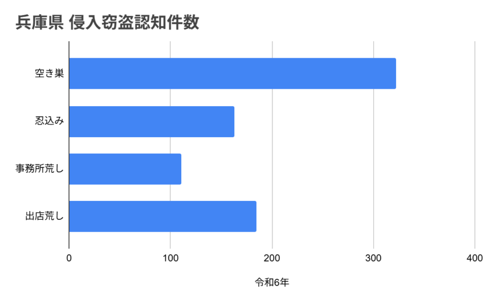 令和6年のデータによると、侵入窃盗に該当する主な犯行の内訳は空き巣322件、忍込み163件、事務所荒し111件、出店荒し185件となっています。最も件数が多いのは空き巣であり、住宅の無人時間帯を狙った犯行が依然として高い頻度で発生していることがわかります。