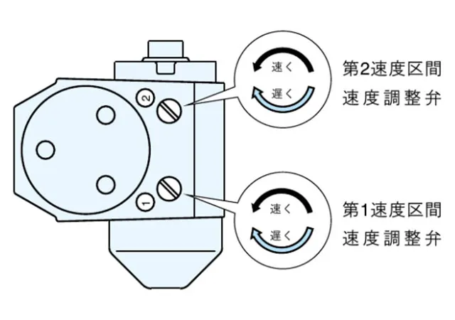 ドアクローザーの速度調整弁が2個ある場合は、ドアの閉まりはじめ(第一速度区間)と閉まり終わり(第二速度区間)にそれぞれ調整弁が分かれています。